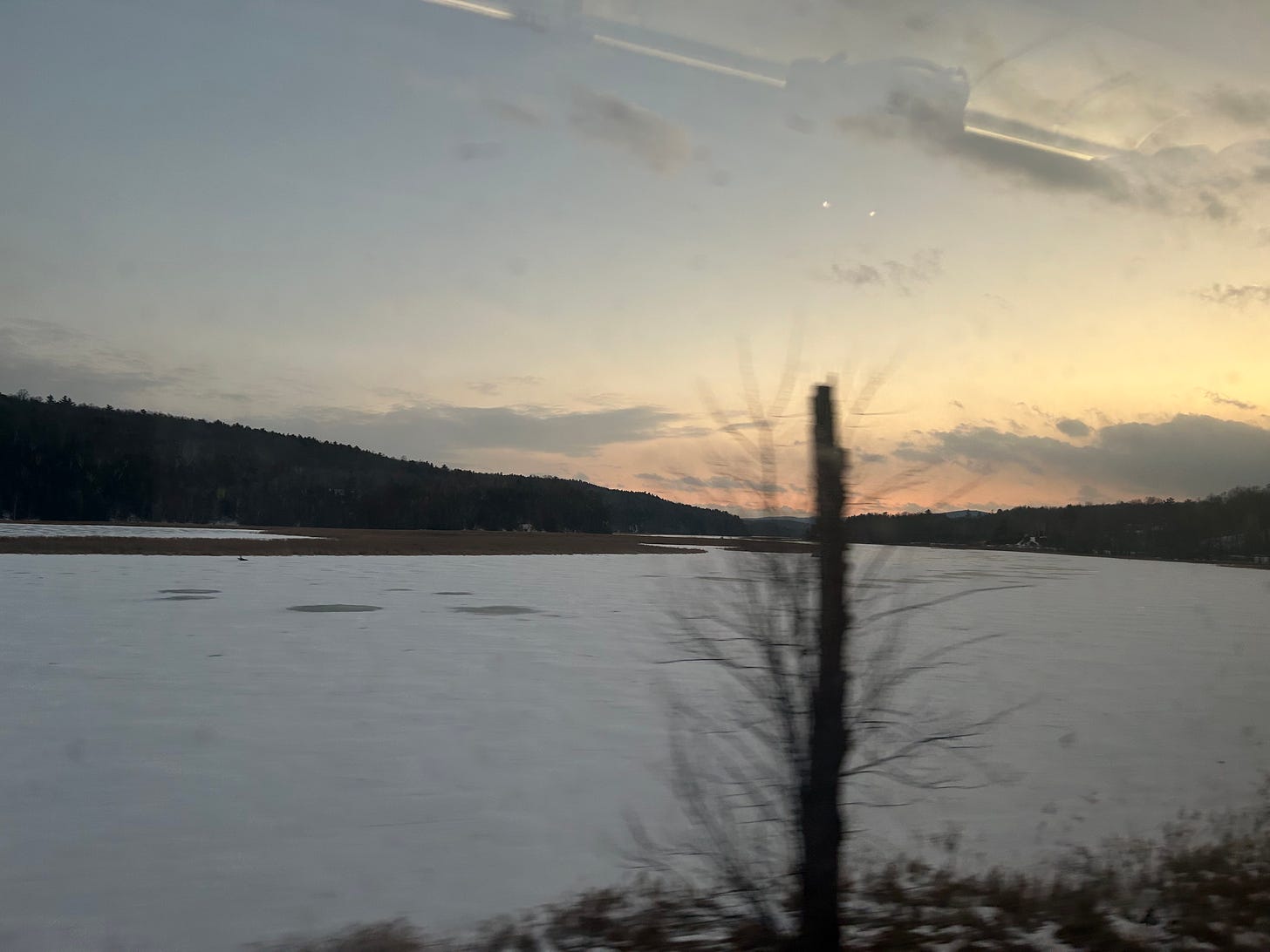 The train gets stuck for three hours in Albany. They are looking for a new engine. I’m watching my best friend’s movie on my phone trying to cover the screen because there are so many naked girls. Oh my god I love this movie. I barely noticed we weren’t moving. After that I listen to the same three songs for five hours and watch the snowstorm outside. Rushing wind and open white lake. I get up to check my pupils in the bathroom mirror because they just keep getting bigger. Keep watching me, keep paying attention.